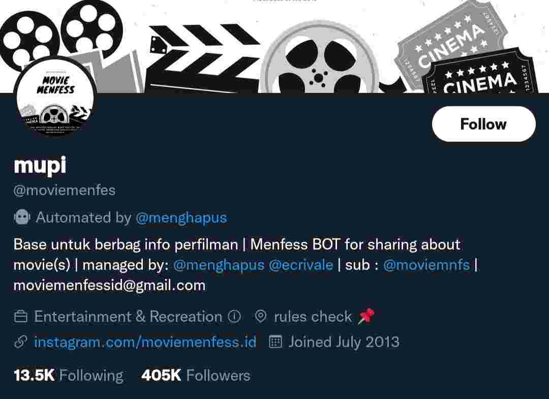 Jika Anda bermain Twitter, mungkin sering melihat akun Moviemenfes bermunculan di timeline baik kalian mengikutinya atau tidak. Bahkan kalau Anda tidak follow bakal muncul juga, karena bisa jadi salah satu teman Anda followingnya ada akun tersebut.